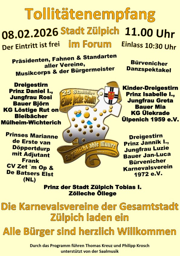 Mit eigenen Veranstaltungen, mitreißenden Tanzgruppen und stimmungsvollen Umzügen sorgen wir jedes Jahr aufs Neue für gute Laune – nicht nur in unserer Heimatstadt Zülpich, sondern auch im gesamten Kreis Euskirchen und darüber hinaus.